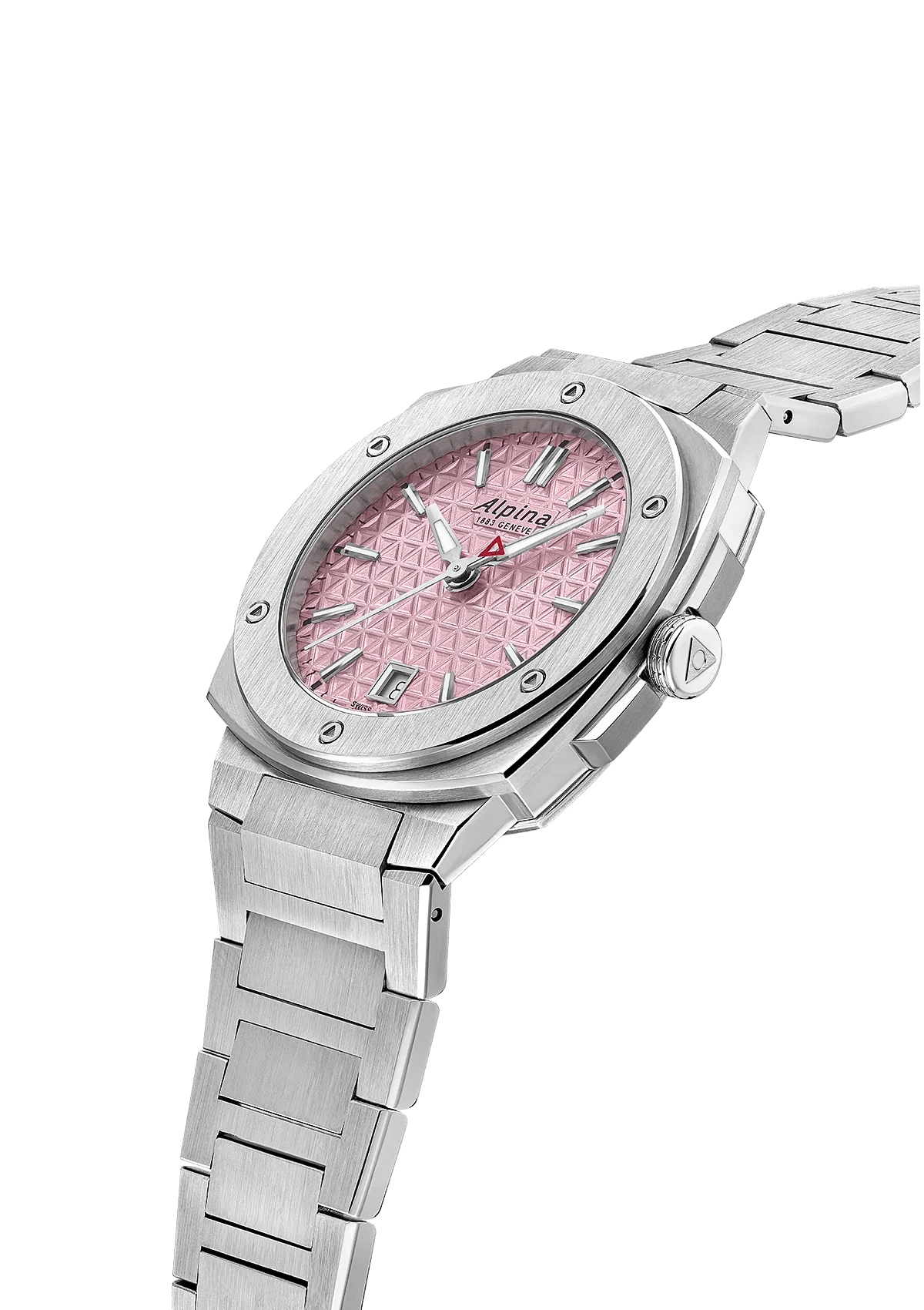 Il quadrante rosa opaco presenta un motivo a triangoli, conferendo profondità e carattere al design. Gli indici e le lancette argentate sono trattati con materiale luminescente, garantendo una leggibilità ottimale anche in condizioni di scarsa illuminazione. La finestra della data è posizionata a ore 6, aggiungendo una funzionalità pratica senza compromettere l’estetica.